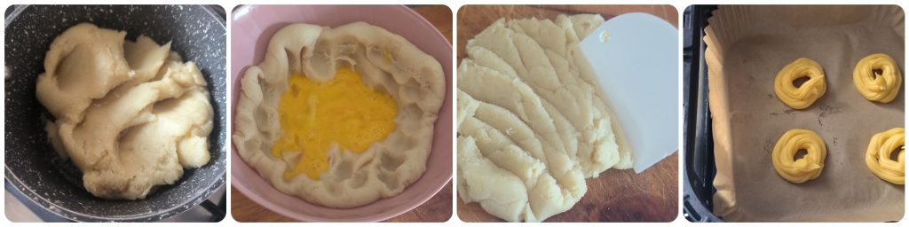 Se trata de una masa hecha con la pasta choux la misma que se usa para hacer los buñuelos y en este caso, están cocidos en freidora de aire como los buñuelos con crema y chocolate y el resultado es fantástico zeppole hinchadas y ligeras que parecen fritas pero no lo son.