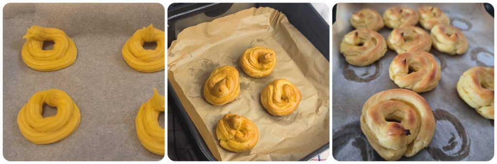 Con la ayuda de la manga pastelera, empieza a formar las zeppole. Su tamaño depende de la boquilla que uses. Haz dos vueltas una sobre la otra; la segunda vuelta debe ir más hacia el interior sin cerrar el hueco central. Si horneas con horno convencional empieza a 200 grados, si usas horno ventilado empieza a 180 grados durante los primeros 10 minutos; luego baja el horno convencional a 180 y el ventilado también a 180, pero nunca debes abrir el horno; completa la cocción durante otros 20 minutos. Las zeppole estarán bien hinchadas y solo entonces abre ligeramente el horno, deja salir un poco de aire y continúa la cocción otros 5 minutos, luego sácalas y deja enfriar.