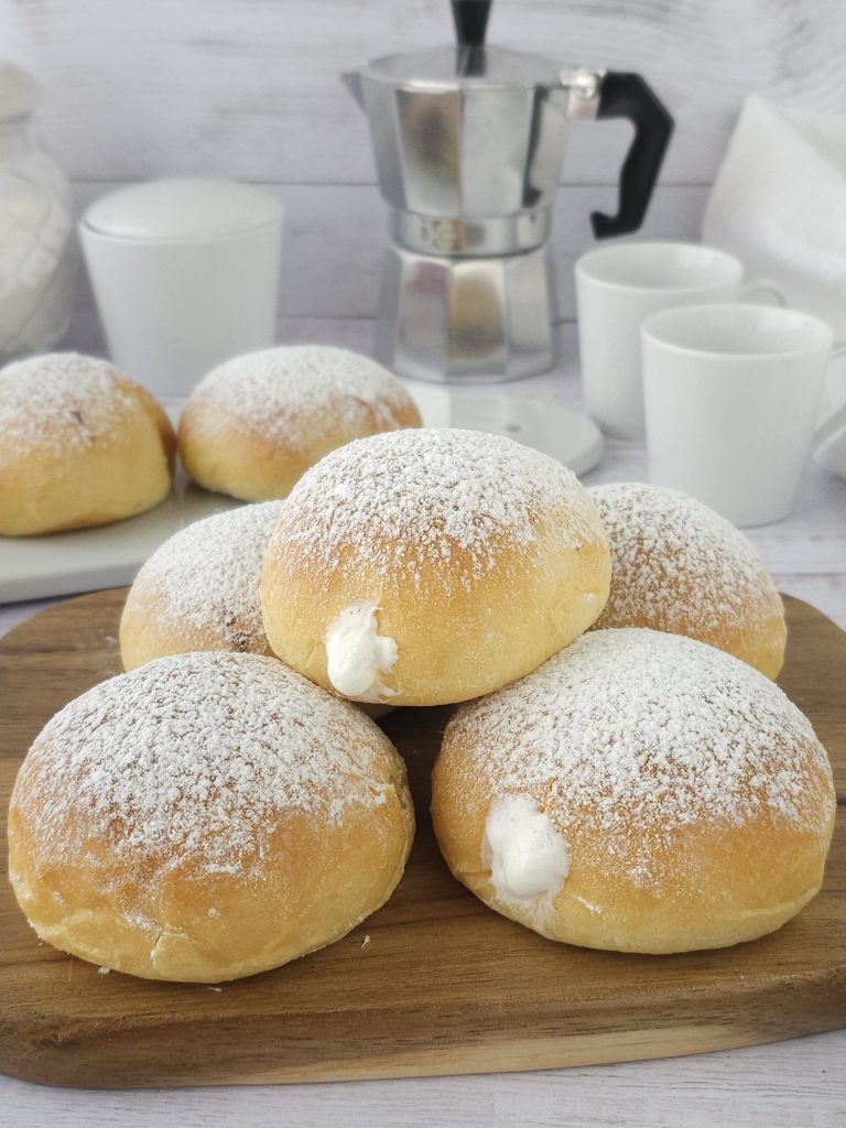 Llenar una jeringa para pasteles con crema de leche y rellenar inmediatamente los bollos. Finalmente, espolvorear la superficie con azúcar glas y disfrutarlos.