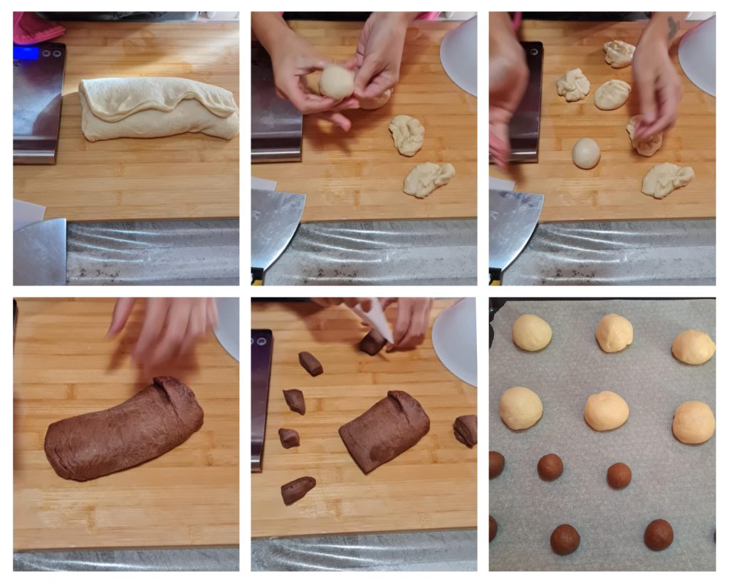 • Después de que las dos masas hayan doblado su tamaño, volcar la masa blanca sobre una mesa de trabajo. Desinflarla suavemente con las manos. Ahora, con delicadeza, tomar algunos trozos de masa y formar bolas de aproximadamente 40 g cada una. Volcar también la segunda masa de cacao y formar bolas de 9 g cada una que serán el famoso «tuppo». Hechas las bolas de igual tamaño y peso, colocarlas en una bandeja forrada con papel de horno y dejar fermentar nuevamente durante 50 minutos.