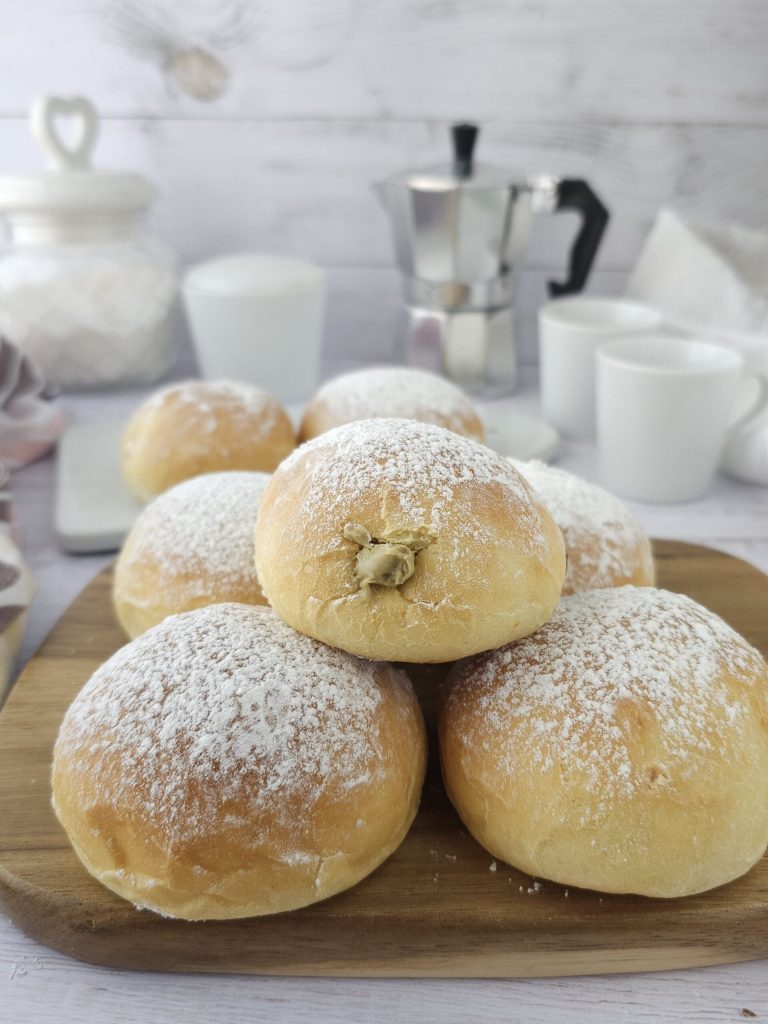 Cuando la masa haya triplicado su tamaño, verterla sobre una mesa de trabajo enharinada y con cuidado tomar algunos trozos de masa y formar bolitas de unos 40 g cada una. Colocarlas en una bandeja revestida con papel de horno y dejar que fermenten nuevamente cubiertas durante 1-2 horas. Cuando hayan doblado su tamaño, hornear en horno estático caliente a 180º durante 10-13 minutos o hasta que estén ligeramente doradas. No deben cocinarse demasiado. Sacarlas del horno y dejar enfriar unos minutos, todavía tibias, utilizar el mango de una cuchara de madera para hacer un agujero desde abajo o desde un lado. Rellenarlas con crema de untar de pistacho utilizando una jeringa para postres o una manga pastelera.