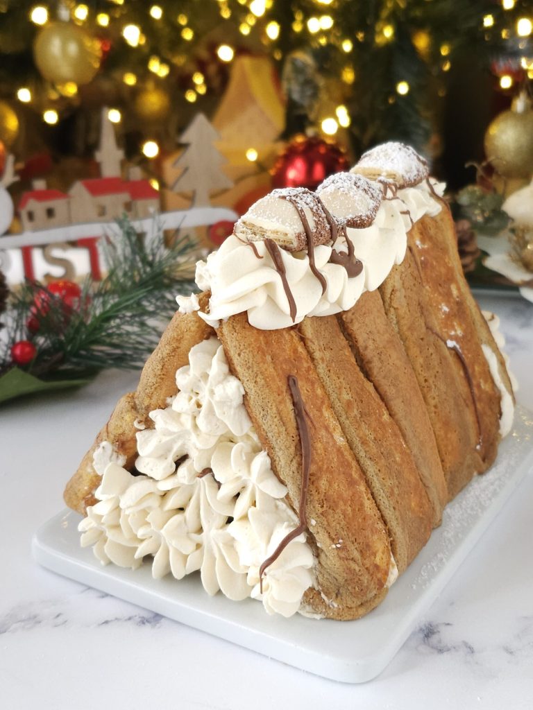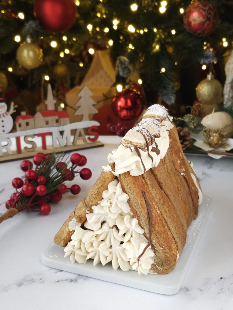 La casita navideña se puede preparar con antelación incluso el día anterior. Se conserva en el frigorífico por un máximo de 2 días. El relleno de crema se puede cambiar a vuestro gusto.