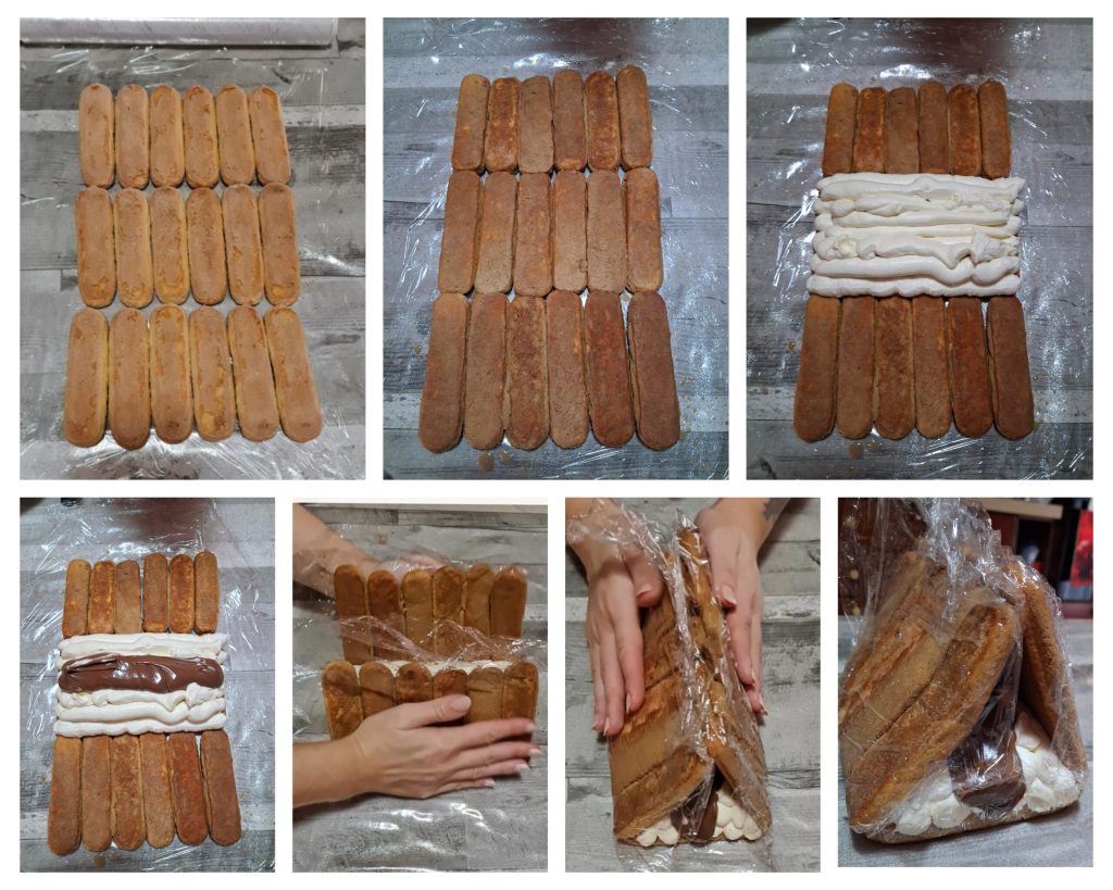 Sobre una superficie de trabajo, extender una hoja de film transparente. Mojar los bizcochos de soletilla en la mezcla de leche y café o leche y cacao durante un par de segundos y colocarlos sobre el film, uno al lado del otro, formando un rectángulo compacto. Formaremos 3 filas de 6 bizcochos de soletilla. Coger la manga pastelera y rellenar solo el centro del rectángulo en altura para luego poner como última capa la nutella, obviamente puesta antes en una manga pastelera. No se debe usar toda la crema de mascarpone, reservar unas cucharadas para la decoración final. Cerrar luego la casita con la ayuda del film dándole forma de pirámide. Compactar bien y colocar en el frigorífico durante 6 horas o en el congelador durante 1 hora.