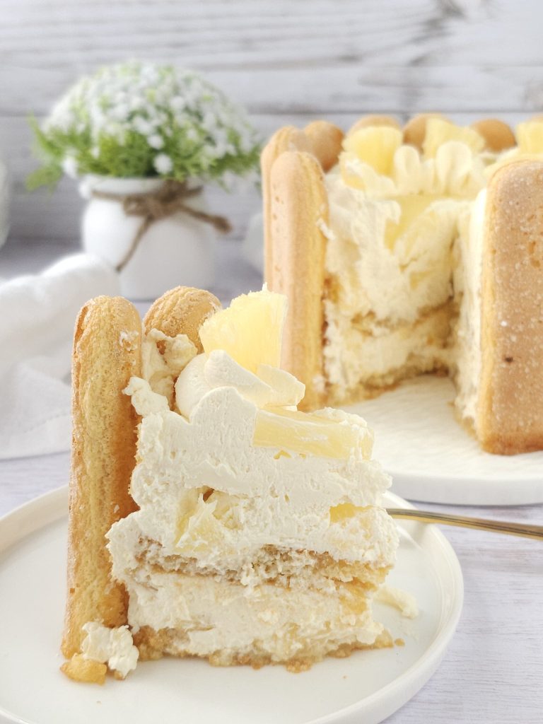 Hola amigos, hoy os propongo esta fabulosa charlotte de piña, realmente muy delicada y deliciosa para realizar en cualquier ocasión. Los postres de piña son excepcionales, esta receta además es sin cocción, por lo que es aún más fácil y rápida de hacer. A continuación encontraréis la receta.