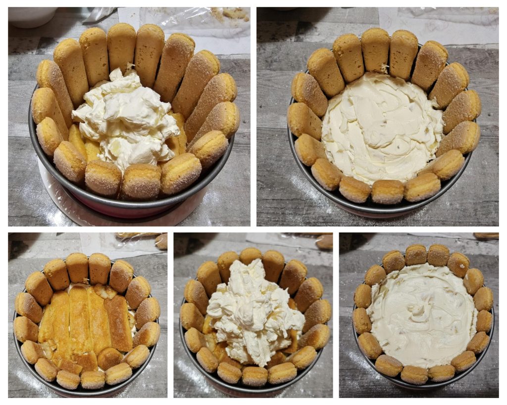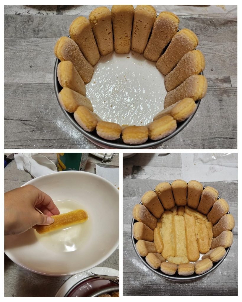 Forrar la base de un molde desmontable de 20 cm con papel de horno o también podéis usar un plato de servir y colocar el aro sobre el plato. Disponer los bizcochos de soletilla sin mojarlos en forma de corona, tratando de encajarlos bien sin que se caigan. Si se desea, se pueden cortar los bizcochos por la mitad a lo largo para hacer una charlotte más baja. Luego colocar en el fondo del molde los bizcochos ligeramente mojados en el zumo de piña y poner la tarta en la nevera para que se endurezca durante aproximadamente media hora. No recomiendo empapar los bizcochos como cuando se hace un tiramisú porque la crema ya tiende a ablandar los bizcochos.