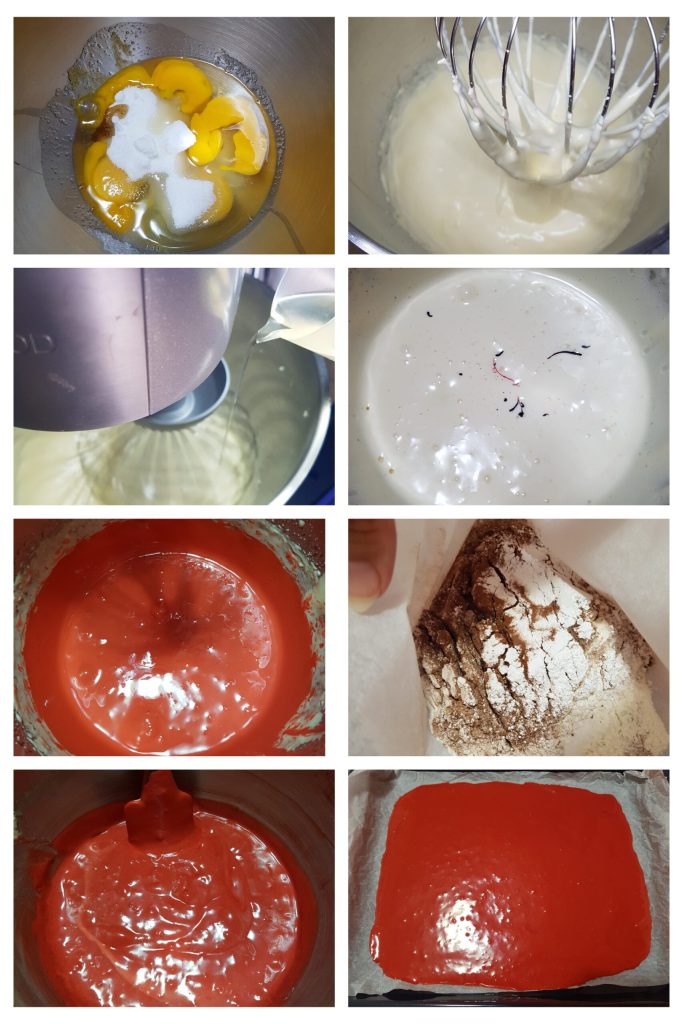 Para realizar esta maravillosa cheesecake de terciopelo rojo, se debe primero preparar la masa. En un cuenco grande, batir los huevos con el azúcar y la esencia de vainilla durante 15 minutos hasta que estén espumosos y blanquecinos, añadir el colorante alimentario rojo en gel de la marca decora (recomiendo principalmente este colorante porque lo considero el mejor para lograr la coloración correcta), verter también el aceite de girasol en un hilo y seguir batiendo. Finalmente, añadir la harina y el cacao amargo previamente tamizados con la levadura y la sal, y mezclar de nuevo con una espátula de abajo hacia arriba sin desmontar la mezcla hasta obtener una masa lisa y homogénea. Cubrir un molde rectangular o bandeja de horno de 30×40 cm con papel de horno mojado y escurrido, y verter la mezcla nivelando bien con una espátula lisa. Cocer en horno caliente estático a 180° durante unos 15 minutos. Hacer la prueba del palillo, y con mucho cuidado, despegar el papel de horno de la base y colocarla en una bandeja.