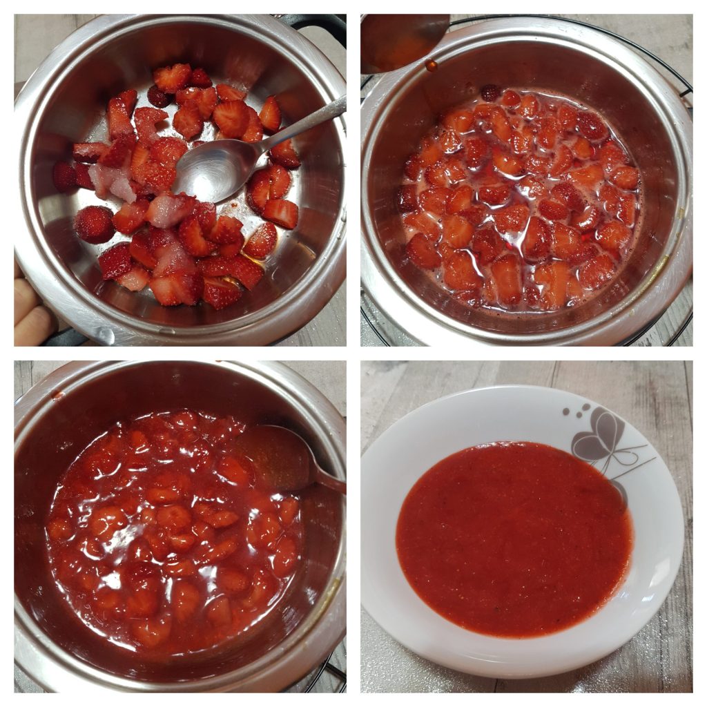 En una sartén, verter las fresas cortadas previamente en cubitos y añadir el zumo de limón, el azúcar granulada y mezclar, añadir un chorrito de agua y poner al fuego a llama baja a cocer durante unos diez minutos. Por último, disolver una cucharadita de almidón de maíz en un chorrito de agua y verter en la mezcla. Mezclar con cuidado y cuando las fresas estén cremosas y blandas, apagar y dejar enfriar completamente. Finalmente, triturarlas usando una batidora de inmersión para hacerlas cremosas. Si no es temporada de fresas, se pueden usar frambuesas frescas o frutos rojos o frutos del bosque.