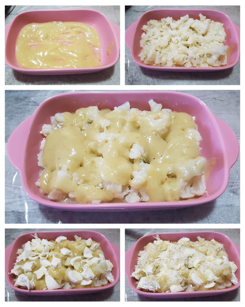 Para realizar esta deliciosa coliflor gratinada al horno hay que preparar primero la coliflor hervida en agua caliente con sal, luego escurrir y dejar enfriar. Preparar también de antemano la bechamel vegana. Ahora vamos a ello. Engrasar la base de una fuente de horno con unas cucharadas de bechamel vegana y verter toda la coliflor. Espolvorear con queso parmesano rallado y mozzarella en cubos, finalmente rociar con más bechamel, parmesano y pan rallado al gusto y al horno. Cocinar a 200º justo el tiempo de gratinar, unos 10-15 minutos.