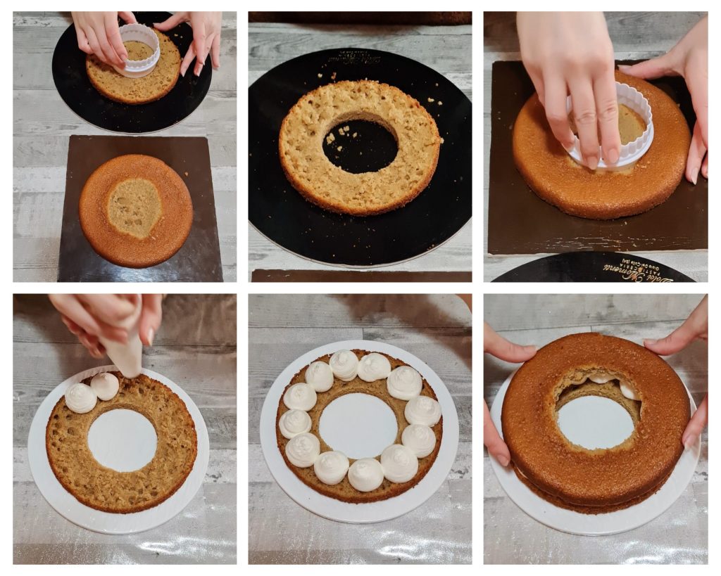 Cuando la base esté lista, cortarla en dos y recortar o cortar el centro con un cortapastas redondo más pequeño. Colocar el primer disco sobre un plato de servir, mojar la base con leche o con un almíbar (si se desea con alcohol), sacar la crema de mascarpone del frigorífico y ponerla en una manga pastelera con boquilla lisa. Rellenar toda la superficie con la crema de mascarpone formando muchos montoncitos uno al lado del otro. Colocar el otro disco y continuar la decoración siempre creando muchos montoncitos de crema de mascarpone.