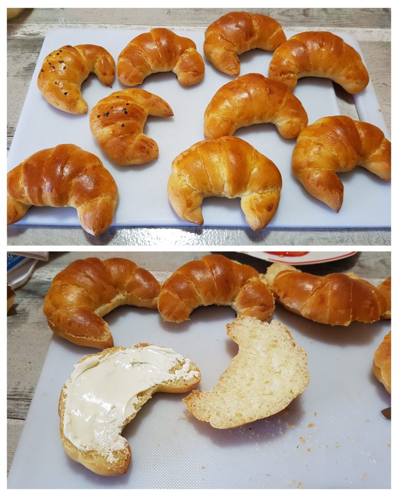 Sobre una mesa de trabajo enharinada colocar la masa brioche ya fermentada y desinflarla con las manos. Extender primero con las manos y luego con la ayuda de un rodillo formar una lámina de 5 mm de grosor formando un rectángulo. Con una rueda o cuchillo formar triángulos de igual tamaño (los míos medían aproximadamente 10 cm de base y 20 cm de altura). Formados los triángulos, enrollarlos sobre sí mismos comenzando desde la parte inferior hasta la punta tirando ligeramente. Cuanto más largo sea el triángulo, más vueltas se podrán hacer y más bonitos quedarán estéticamente. Colocar los croissants sobre una bandeja de horno cubierta con papel de horno, distanciarlos entre sí y cubrirlos con film transparente y dejarlos fermentar durante aproximadamente 2 horas siempre en el horno cerrado con la luz encendida.