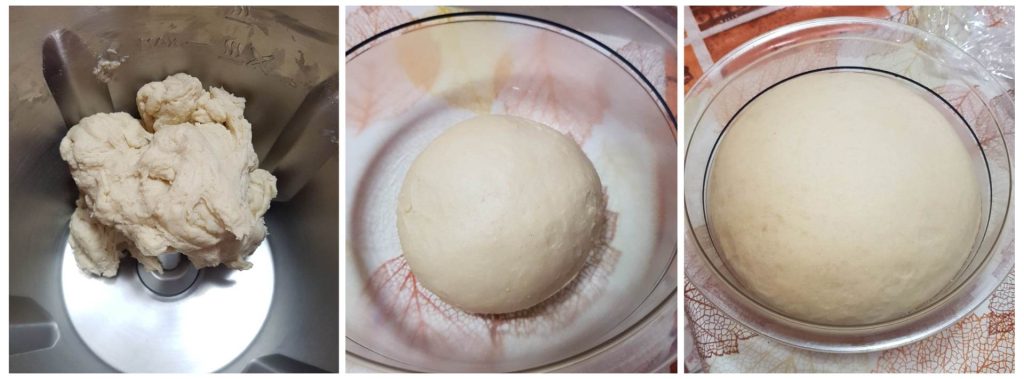 Para preparar esta focaccia rellena con jamón cocido es necesario primero preparar la masa. Por comodidad, utilicé la amasadora, pero si queréis, podéis amasar todo a mano en un bol. En el bol de la amasadora, añadir las dos harinas tamizadas, la levadura con el azúcar disuelto previamente en la mitad de la leche y comenzar a amasar utilizando el gancho a velocidad 1-2, incorporar poco a poco el resto de la leche y seguir amasando durante 5 minutos. Añadir la sal y continuar amasando durante unos 8 minutos. Finalmente, añadir la mantequilla blanda poco a poco y amasar durante otros 5-8 minutos. Mis tiempos son indicativos según la potencia de mi amasadora, tardará al final unos 18 minutos para obtener una masa suave, elástica y homogénea. Colocar la masa en un bol engrasado, cubrir con film transparente y dejar levar a temperatura ambiente durante 2-3 horas hasta que doble su tamaño.