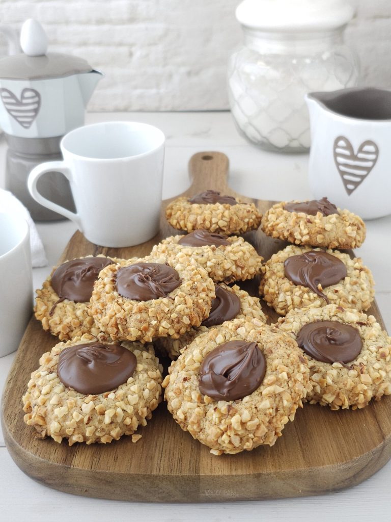 Hola amigos, hoy os propongo estas maravillosas galletas con huella de avellana, hazelnut thumbprint cookies con Nutella para disfrutar en cualquier ocasión. Son unas simples galletas de avellana con la típica forma de huella que se realiza con el mango de una cuchara de madera o con el dorso de los típicos cucharones medidores. Podríamos llamarlas también galletas botón o gema y rellenarlas con Nutella, crema pastelera o mermelada. A continuación, encontraréis la receta..