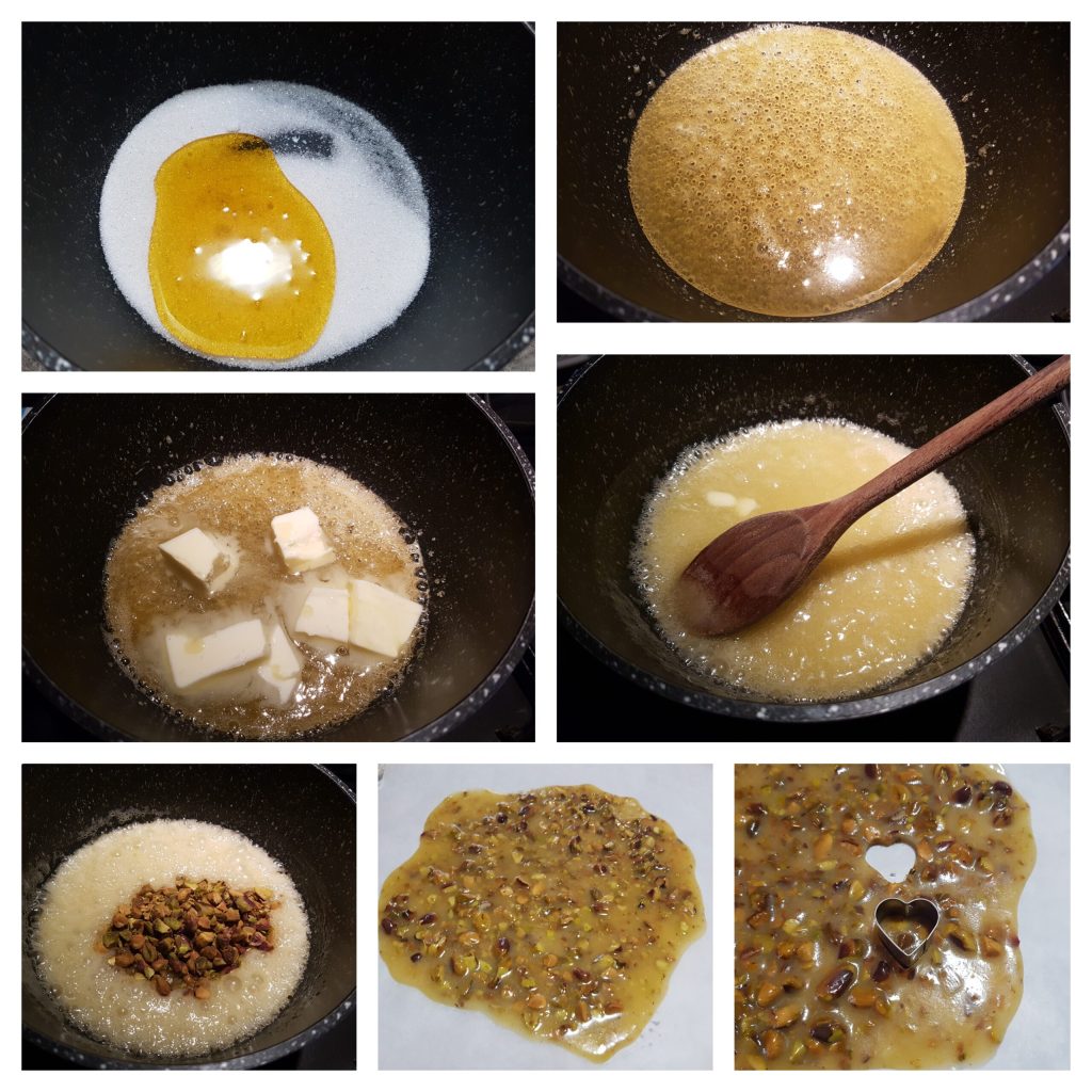 Derretir en un cazo el azúcar granulada con la miel, luego añadir la mantequilla y mezclar cuidadosamente. Cuando la mezcla esté blanquecina, verter los pistachos y mezclar cuidadosamente. Verter la mezcla sobre una bandeja de acero cubierta con papel de horno y nivelar con una espátula. Dejar enfriar durante un par de horas. Cuando esté completamente frío y tenga una consistencia dura como el turrón o el crujiente, utilizando un molde o cortador de galletas en forma de corazón, obtener muchas placas de pistacho y reservar.