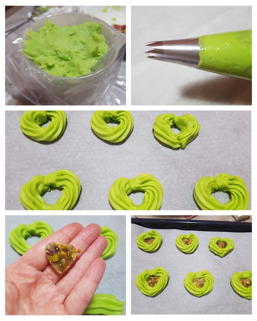 Colocar la masa de pastaflora montada en una manga pastelera equipada con una boquilla de estrella y formar en una bandeja cubierta con papel de horno las galletas en forma de corazón. Colocar en el centro de cada galleta una placa al pistacho. Dejar reposar la bandeja de galletas en el frigorífico durante 1 hora. Cocinar luego en horno caliente estático a 180ºC durante 12-15 minutos. Apagar y dejar enfriar.