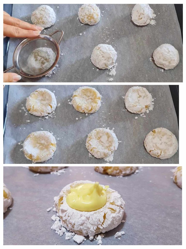 Sacar con las manos pequeñas cantidades de masa, aproximadamente 25 g cada una y formar bolitas. Enrollarlas en un plato hondo con azúcar glas, de modo que queden completamente recubiertas. Colocar las bolitas en una bandeja cubierta con papel de horno y con la ayuda de un pequeño colador presionar cada bolita haciendo un surco. Colocar en el centro una cucharadita de lemon curd preparado previamente (aquí encontraréis el enlace de la receta para hacer en casa https://blog.giallozafferano.it/rosly/ricetta-lemon-curd-crema-al-limone-anglosassone/). Hornear en horno precalentado a 180º durante 10-12 minutos o hasta que estén ligeramente doradas. Apagar, sacar del horno y dejar enfriar completamente sin tocarlas.