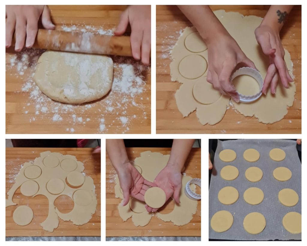 Retira la masa quebrada del frigorífico, trabaja un poco con las manos y sobre una tabla de amasar enharinada utiliza un rodillo para extender una lámina de 3 mm de grosor. Con un cortador de galletas redondo de 6-8 cm, haz muchos discos. Colócalos en una bandeja forrada con papel de horno y pon la bandeja en el frigorífico durante 1 hora o en el congelador durante 20 minutos. Luego hornea en un horno estático precalentado a 170º durante 10-15 minutos. Apaga, saca del horno y deja enfriar sin tocarlos.