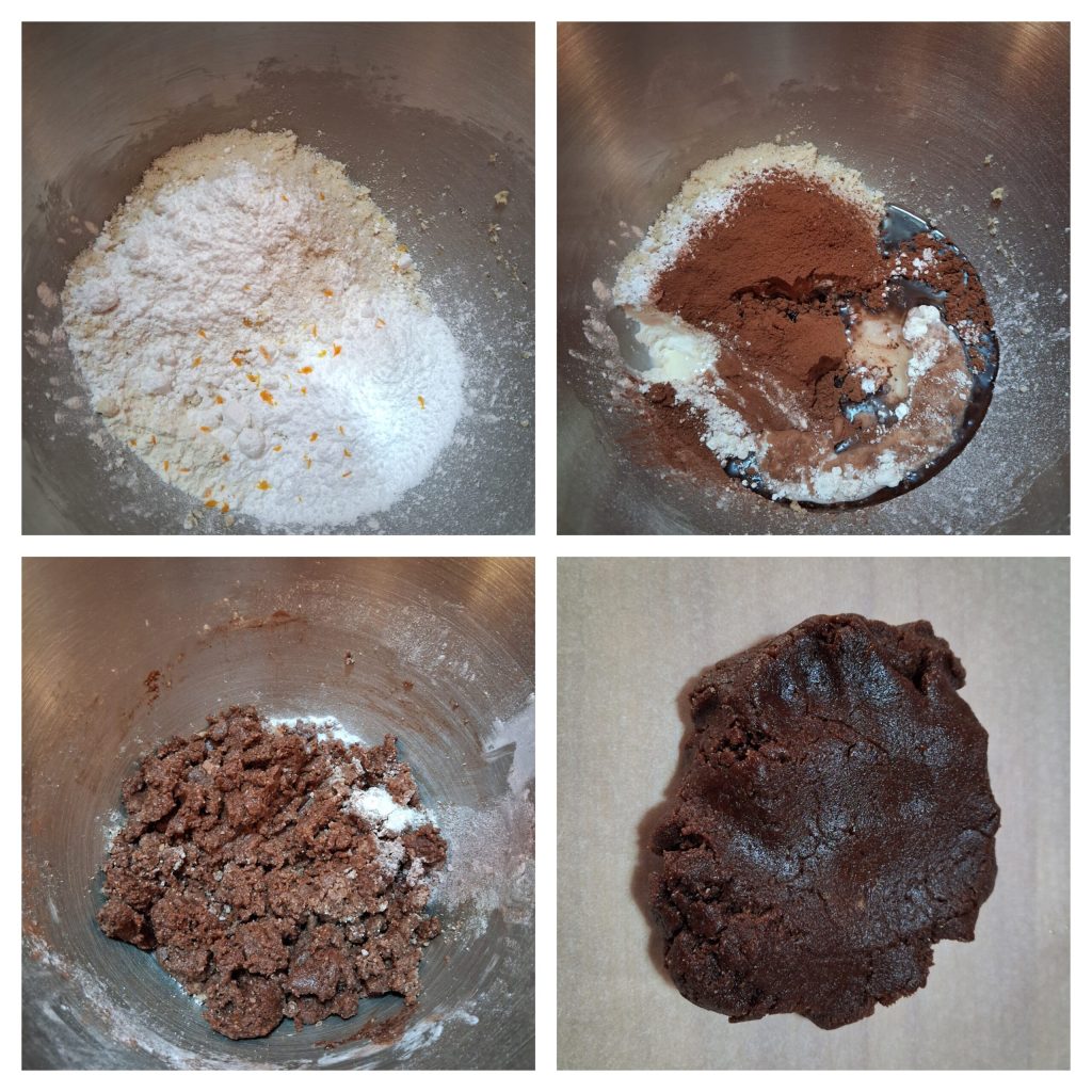 Para hacer estas maravillosas galletas de Navidad rellenas, primero hay que preparar la masa quebrada. Yo he usado la amasadora con el gancho (K). Si queréis, podéis amasar todo a mano en un bol y luego en una superficie de trabajo. Verter en el bol de la amasadora el azúcar glas, la harina 00, la harina de almendra, el cacao amargo, las especias, la ralladura de naranja, la sal fina, la levadura, el aceite y la leche, amasando durante unos minutos a velocidad 2-3. Luego añadir medio huevo, no todo, por lo tanto, será necesario romper un huevo en un bol pequeño, batirlo con un tenedor y añadir solo la mitad al compuesto. Amasar con cuidado hasta compactar por completo la mezcla. La masa resultará suave y homogénea. Dejar a un lado y preparar el relleno.