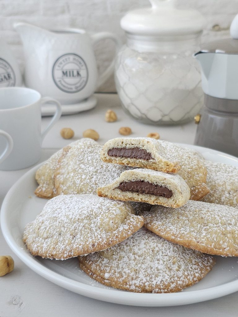 Para preparar estas galletas luna crescent de avellana rellenas de nutella, podéis usar cualquier robot de cocina o amasar a mano en un bol y luego en una superficie de trabajo. Por comodidad, he usado la amasadora. En el bol de la amasadora, verter la harina 00, el azúcar granulada, la harina de avellanas, la fécula de patata, la sal, la levadura, la mantequilla fría en trozos y la esencia de vainilla, y poner en marcha la máquina a velocidad 2 durante unos minutos utilizando el gancho de hoja (K). Añadir luego los huevos y mezclar durante unos minutos más hasta obtener una masa homogénea. Dejar reposar la masa quebrada en la nevera envuelta en film transparente durante aproximadamente 1 hora. También podéis hacerla el día anterior y dejar la masa quebrada en la nevera toda la noche. Sacar la masa quebrada de la nevera, trabajarla un poco con las manos y, en una superficie enharinada, utilizando un rodillo, extender una lámina de 3-4 mm de grosor y cortar discos con un cortador redondo. Colocar estos discos de masa quebrada en el utensilio para hacer raviolis y rellenar el centro con una cucharada de nutella, cerrar y sellar bien. Si no tenéis este utensilio, podéis hacerlos a mano, como hacía mi abuela, cortando un disco de masa con un vaso, colocando el relleno en el centro, cerrando en forma de media luna y sellando bien los bordes con los dientes de un tenedor. Colocar todas las galletas luna crescent en una bandeja de horno forrada con papel de horno y hornear en horno estático precalentado a 170°C durante aproximadamente 15-17 minutos. Apagar el horno, sacar del horno y dejar enfriar.