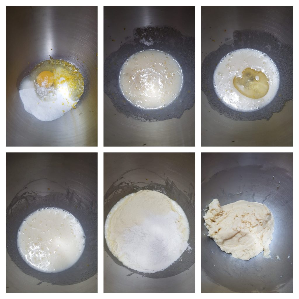 Como primer paso para realizar estas galletas para mojar con sémola remolida y harina de arroz, necesitas mezclar todo comenzando por los líquidos. Puedes usar un bol grande y amasar a mano o usando cualquier robot de cocina. Yo he usado la amasadora y he usado el gancho de hoja (K). Vierte en el bol de la amasadora el huevo, el azúcar y mezcla durante unos minutos a velocidad media. Luego agrega el aceite, la leche, la cáscara de limón rallada y la esencia de vainilla, y mezcla durante unos minutos más. Finalmente, añade las dos harinas, la sal y la levadura en polvo y mezcla de nuevo hasta compactar completamente la masa. La masa será homogénea y suave.