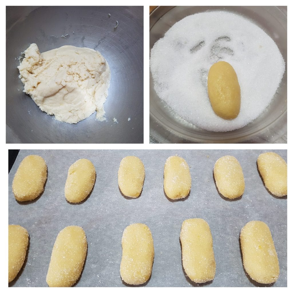 Separar con las manos la masa obteniendo bolas del tamaño de una nuez, luego alargarlas entre las manos creando pequeños cordones. Pasarlos por azúcar granulada y colocarlos en una bandeja de horno cubierta con papel de horno. Hornear en horno estático precalentado a 180ºC durante 20 minutos o hasta que estén doradas. Apagar, sacar del horno y dejar enfriar.