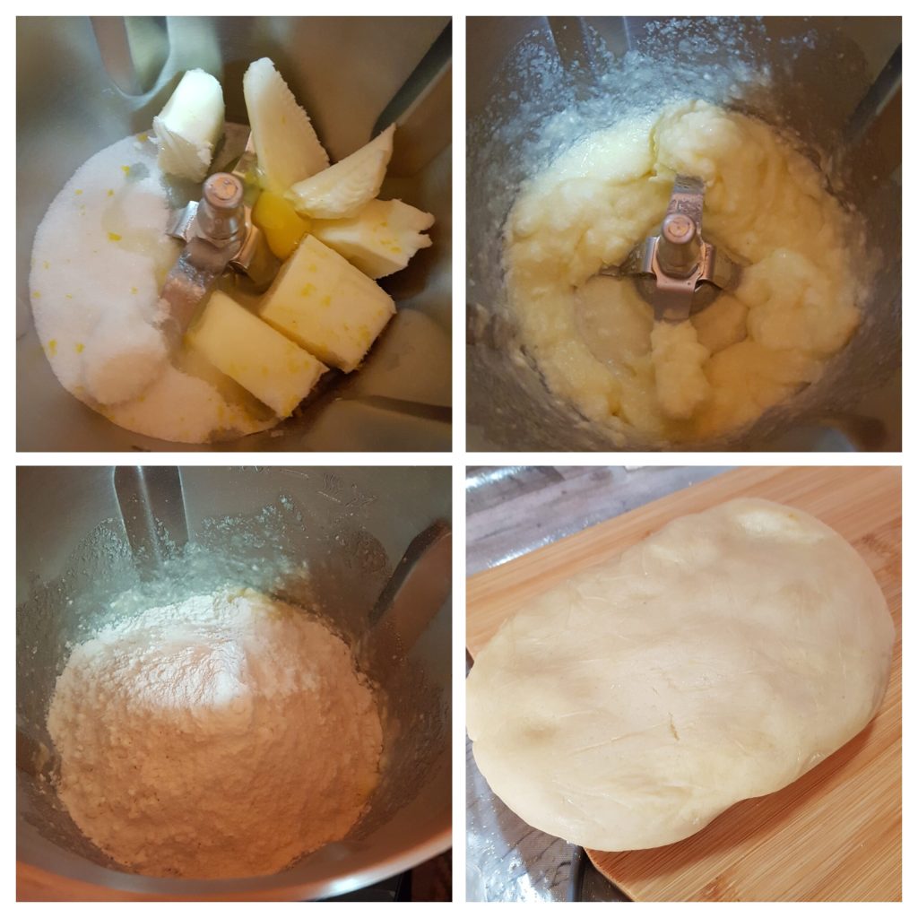 Para empezar a hacer estas deliciosas galletas rellenas de manzana, necesitamos preparar la masa quebrada. Si queréis, podéis amasar todo a mano en un bol o usar un robot de cocina como una amasadora o una thermomix. Yo, por comodidad, he usado la thermomix. En el bol, añadir la mantequilla fría en trozos, el azúcar granulada, la pizca de sal, la canela, la ralladura de limón y mezclar a velocidad 4 durante 50 segundos. Tras obtener una mezcla cremosa, añadir el huevo y seguir amasando. Finalmente, añadir la harina y la levadura y amasar de nuevo a velocidad 4-5 durante 1 minuto hasta obtener una mezcla homogénea. Compactar bien la masa quebrada y colocarla en papel film para alimentos y dejarla reposar en la nevera durante 1 hora.