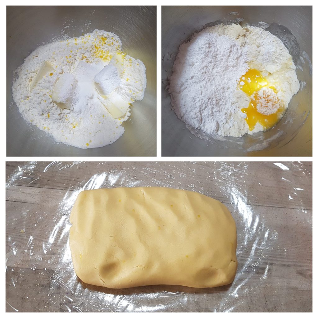 • Para realizar estas deliciosas galletas es necesario preparar la masa quebrada. Podéis amasarla a mano o en cualquier robot de cocina. Yo utilicé la batidora. Como primer paso, poned el gancho en forma de hoja (la letra K), en el bol de la batidora verted la mantequilla junto con el azúcar glas, la harina tamizada con la pizca de sal y la cáscara rallada de un limón. Poned la máquina a velocidad 2 durante unos minutos. Luego añadid las yemas y mezclad unos minutos más. Finalmente, con el gancho en movimiento, añadid la levadura y mezclad unos segundos hasta obtener una masa lisa y homogénea. Si no se compacta porque las yemas son pequeñas, bastará con añadir un chorrito de leche. Compactad bien la masa quebrada y envolvedla en film, dejándola reposar en el frigorífico durante aproximadamente una hora.
