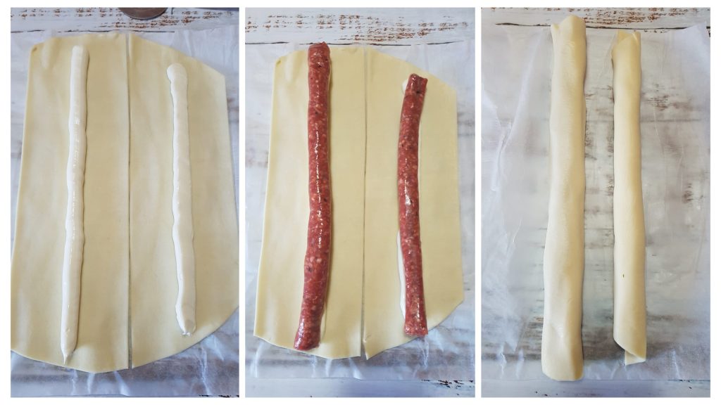 Como primer paso para realizar estos deliciosos mini hojaldres con salchicha es saber que se debe utilizar la típica salchicha larga tipo luganega para crear unos perfectos aperitivos de hojaldre. Desenrollar la lámina de hojaldre rectangular y cortar con un cuchillo en tres partes en sentido vertical. Rellenar una manga pastelera con el queso fresco para untar tipo philadelphia o mascarpone, ricotta o robiola y crear franjas verticales en el centro de cada rectángulo. Sobre cada franja colocar la salchicha y envolver el hojaldre alrededor de la salchicha.