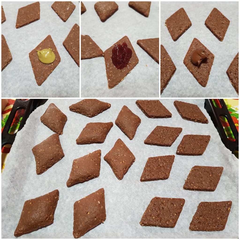 Con un cortador de galletas en forma de rombo, cortar las galletas y colocarlas en una bandeja de horno cubierta con papel de horno. Rellenar cada rombo con una cucharadita de Nutella, mermelada o crema de pistacho. Humedecer ligeramente los bordes de los rombos y cubrir con otro rombo, sellando bien apretando con cuidado. Continuar así hasta terminar la masa.