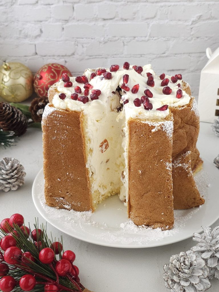 Cortar los dos extremos del pandoro, recortar el interior y vaciar dejando solo un poco de base. Rellenar con una capa de crema de mascarpone y nata, añadir los cubitos de naranja confitada y continuar así hasta rellenar completamente el pandoro también en la superficie y las puntas. Dejar otra parte de la crema para la decoración final. Decorar luego con abundantes granos de granada y poner en la nevera para que se endurezca durante 2 horas. Pasadas las dos horas, sacar el pandoro de la nevera y con la crema restante colocarla colocándola suavemente sobre el pandoro creando una especie de punta. Decorar con otros granos de granada y servir con abundante azúcar glas como si fuera nieve.