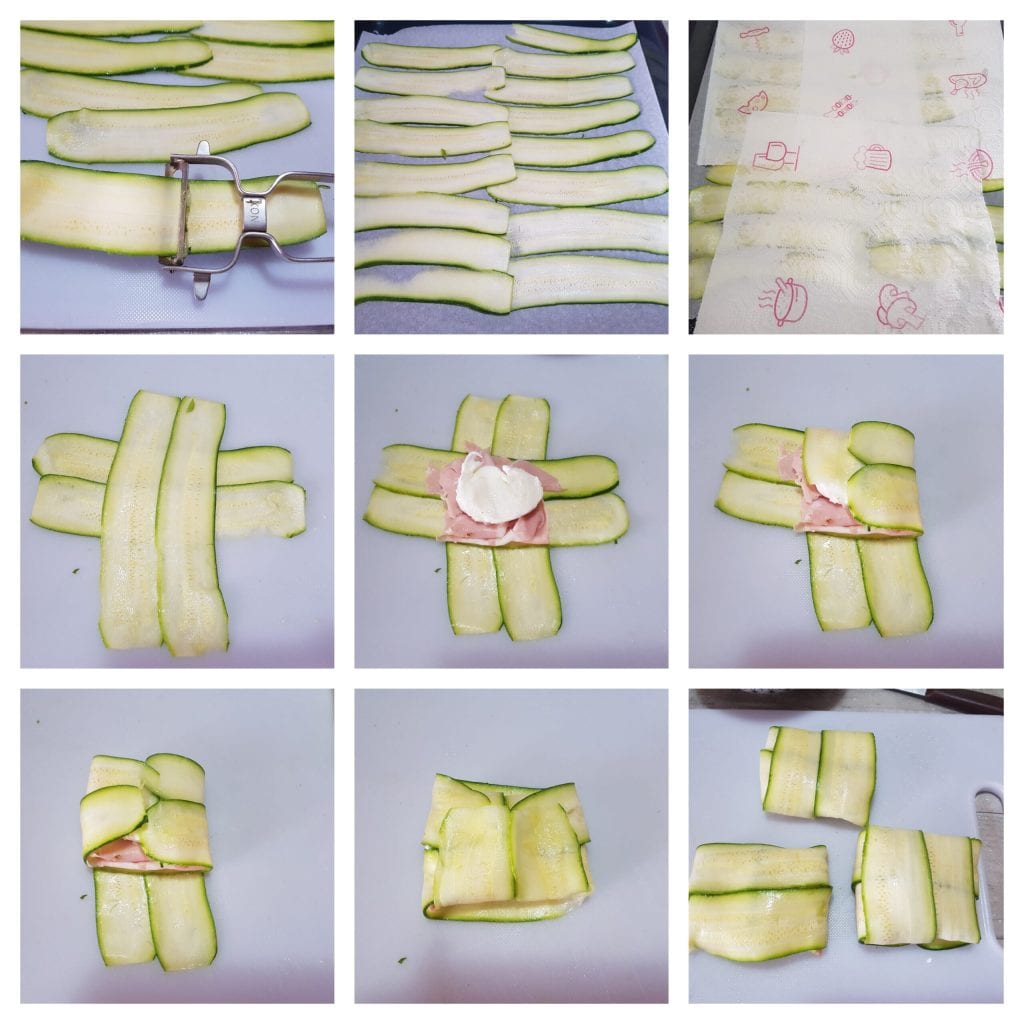 Lo primero para realizar estos paquetitos es lavar los calabacines, cortar los dos extremos y con la ayuda de una mandolina o un pelador de patatas hacer muchas rodajas finas. Colocarlas en una bandeja, espolvorear con sal fina y dejar reposar 30 minutos. Después, secar con papel absorbente y disponer en una tabla de cortar, juntando 2 rodajas de calabacín; superponiendo otras 2 rodajas cruzadas. En el centro colocar una rodaja de mortadela y una de fiordilatte, y cerrar cruzando los bordes del calabacín. Poner los paquetitos con el cierre hacia abajo.