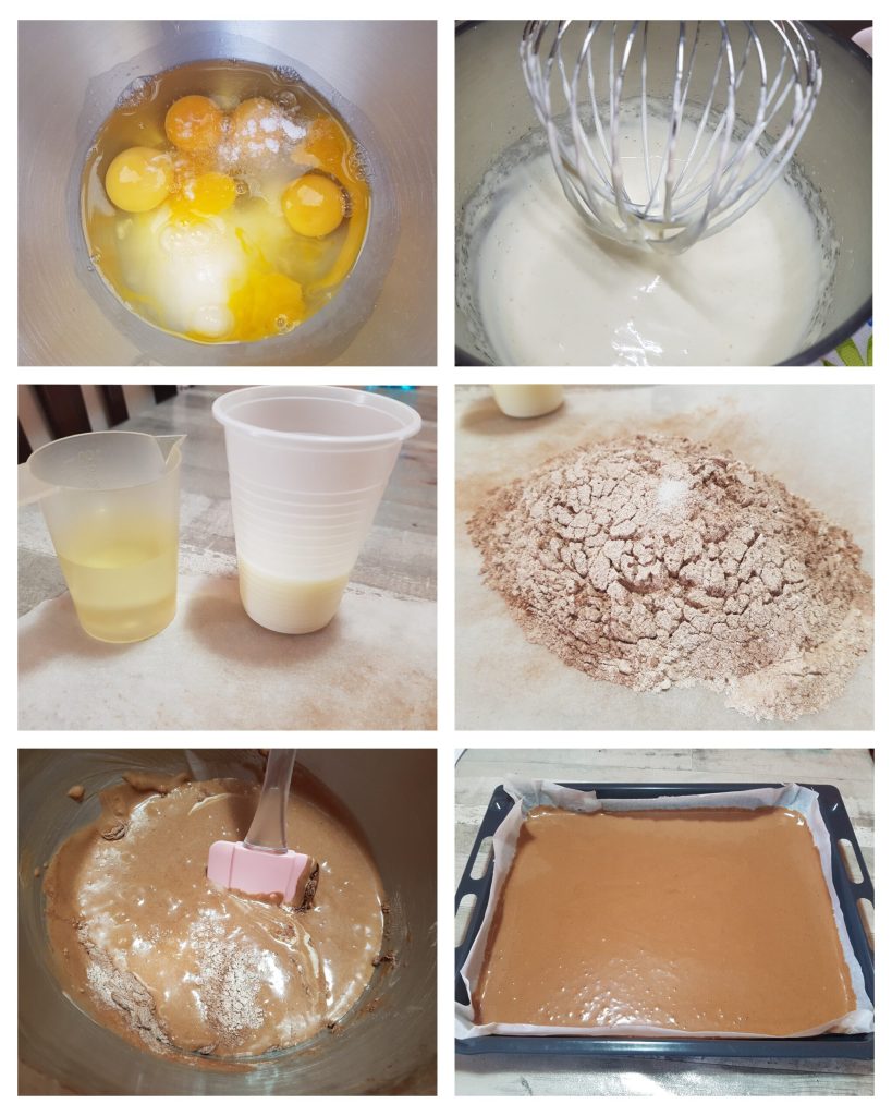 • Para hacer estos pastelitos individuales es necesario preparar con antelación la base suave de cacao. En un bol grande, batir los huevos con el azúcar granulada durante 10-15 minutos hasta que estén espumosos y blanquecinos, añadir el aceite de girasol en hilo y seguir montando. Finalmente, añadir la harina 00, el cacao amargo en polvo, la vainilla, la sal previamente tamizados y mezclar durante unos minutos más hasta obtener una mezcla suave y homogénea. Cubrir una bandeja rectangular o bandeja de horno de 30×40 con papel de horno húmedo y verter la mezcla nivelando bien de manera uniforme con una espátula lisa. Cocer en horno caliente estático a 180° durante unos 15 minutos. Cuando la base esté lista (obviamente hacer la prueba del palillo), colocarla en una tabla de cortar o bandeja y con cuidado quitar el papel de horno y dejar enfriar.