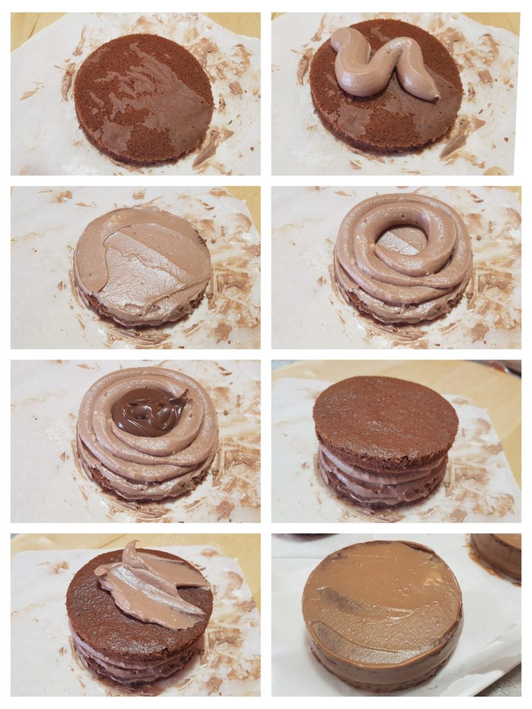 • Con los discos recortados, montar los pastelitos. Colocar el primer disco sobre papel de horno y rellenar con la crema de mascarpone y nutella como en la foto y en el centro añadir una nuez de nutella o crema de avellana. Cerrar sellando con el otro disco y terminar glaseando completamente el pastelito. Continuar así con los otros discos. Colocarlos en una bandeja forrada con papel de horno y meter en el congelador durante 1-2 horas.