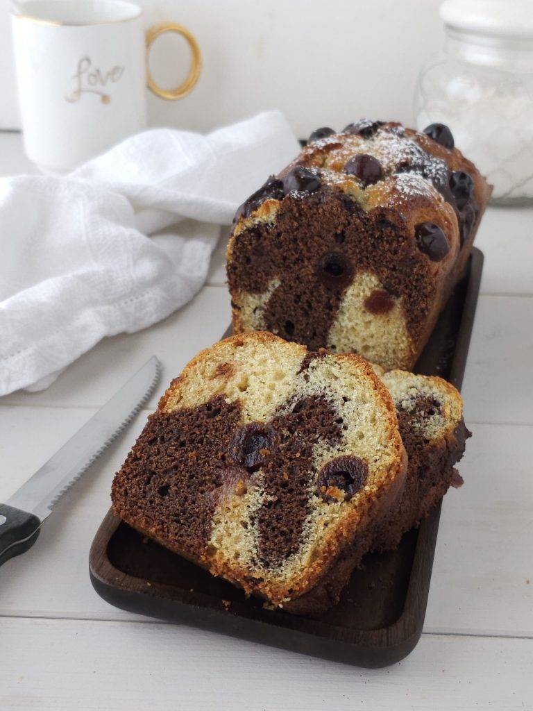 Hola amigos, hoy os propongo este delicioso plumcake marmolado con guindas en almíbar para disfrutar de un espléndido desayuno. Esponjoso y chocolatoso os volverá locos. En lugar de las guindas en almíbar podéis optar por cerezas durante su temporada. A continuación, encontraréis la receta.
