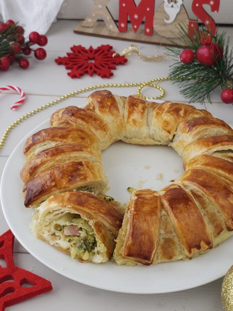 Hola amigos, hoy os propongo esta fabulosa rosca salada de hojaldre para disfrutar y preparar en ocasiones especiales o durante las festividades. Un aperitivo o pastel rústico muy sencillo pero que pondrá de acuerdo a todos y sorprenderá a amigos y familiares. El relleno podéis elegirlo vosotros, yo opté por calabacines salteados, speck, mozzarella y emmental. A continuación encontraréis la receta..