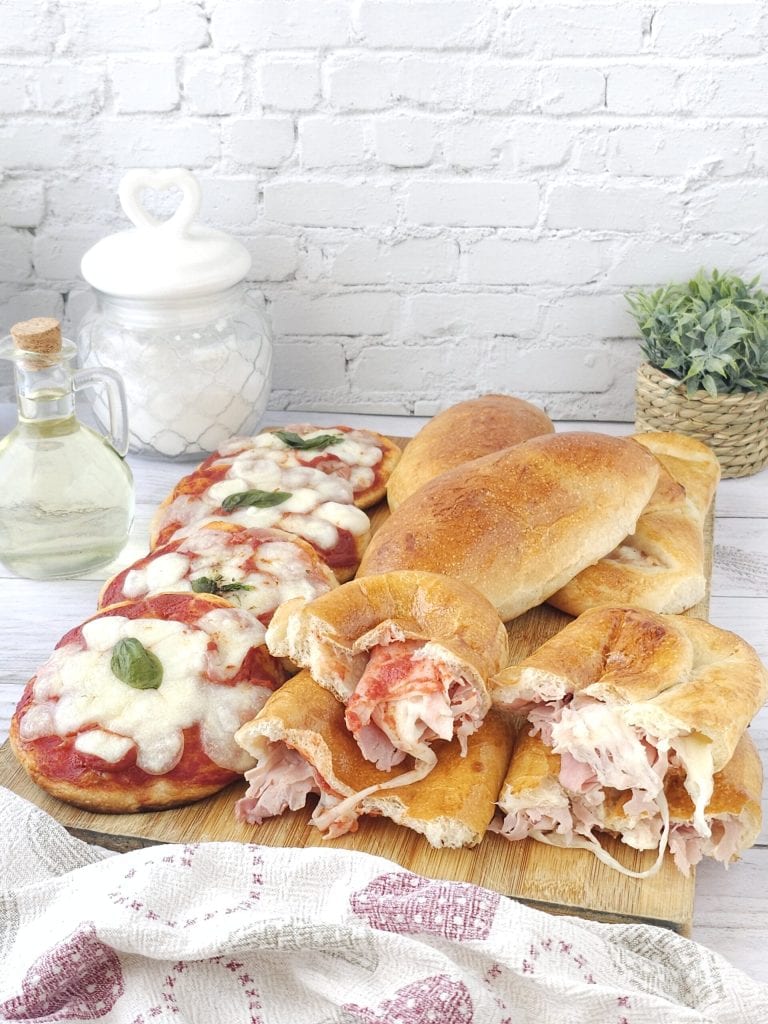 Cuando la masa haya fermentado, formar bolitas de 80 g cada una y dejar fermentar durante una hora. Después de la fermentación, con la ayuda de un rodillo, aplanar cada bolita creando la forma de un círculo, ni demasiado delgado ni grueso, un término medio, y disponer en el centro el jamón cocido y la scamorza, cerrando uniendo los dos extremos de la masa y dejando los dos extremos abiertos. Colocarlas en una bandeja con papel de horno y dejar fermentar durante 40 minutos. Antes de hornearlas, pincelar la superficie con una mezcla de yema de huevo y leche. Luego, hornearlas en horno estático caliente a 180ºC durante 20 minutos o hasta que estén doradas.