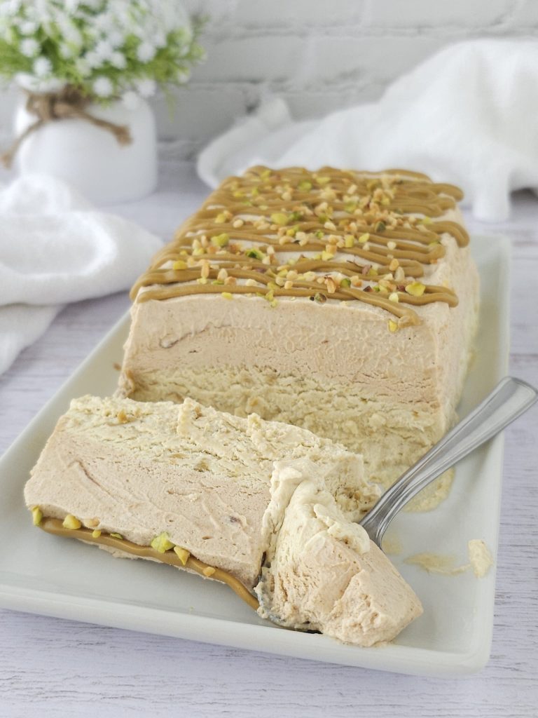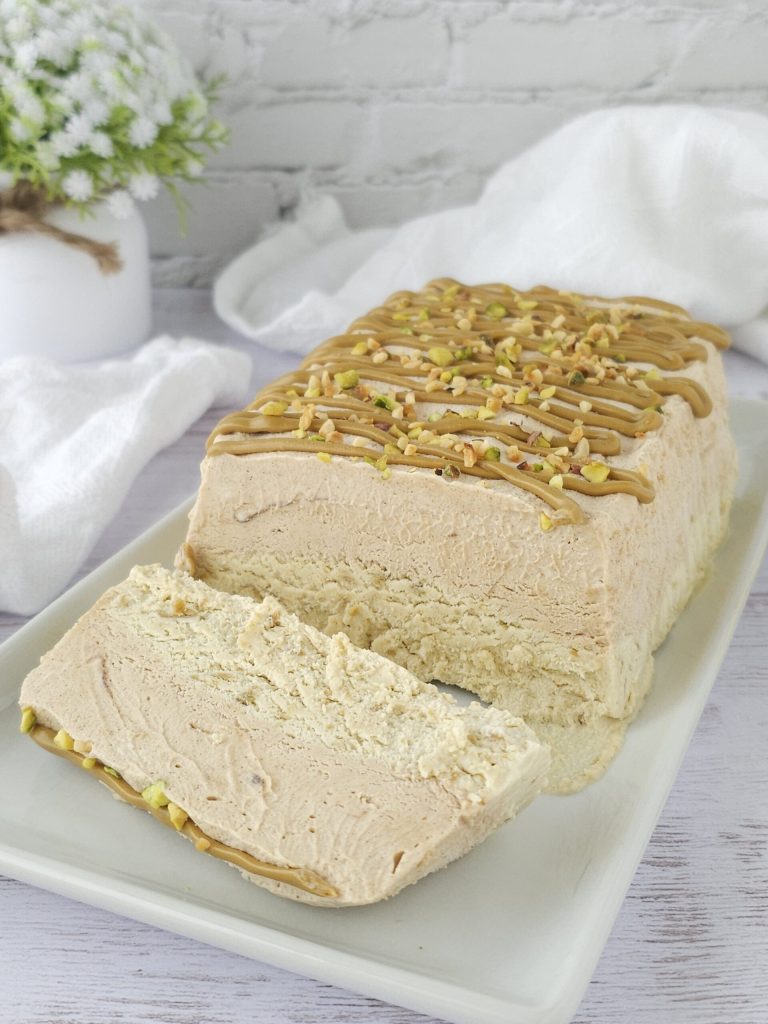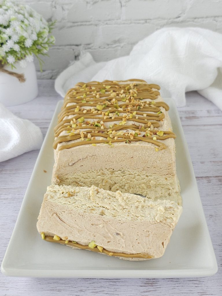 Retirar el molde del congelador, desmoldar con cuidado. Colocar el semifrío en un plato de servicio rectangular y decorar la superficie con crema para untar de pistacho y avellana, y luego granillo de pistachos y avellanas.