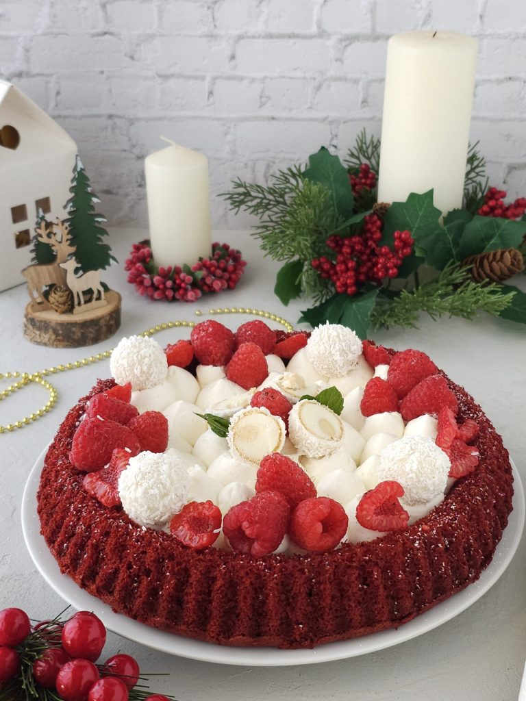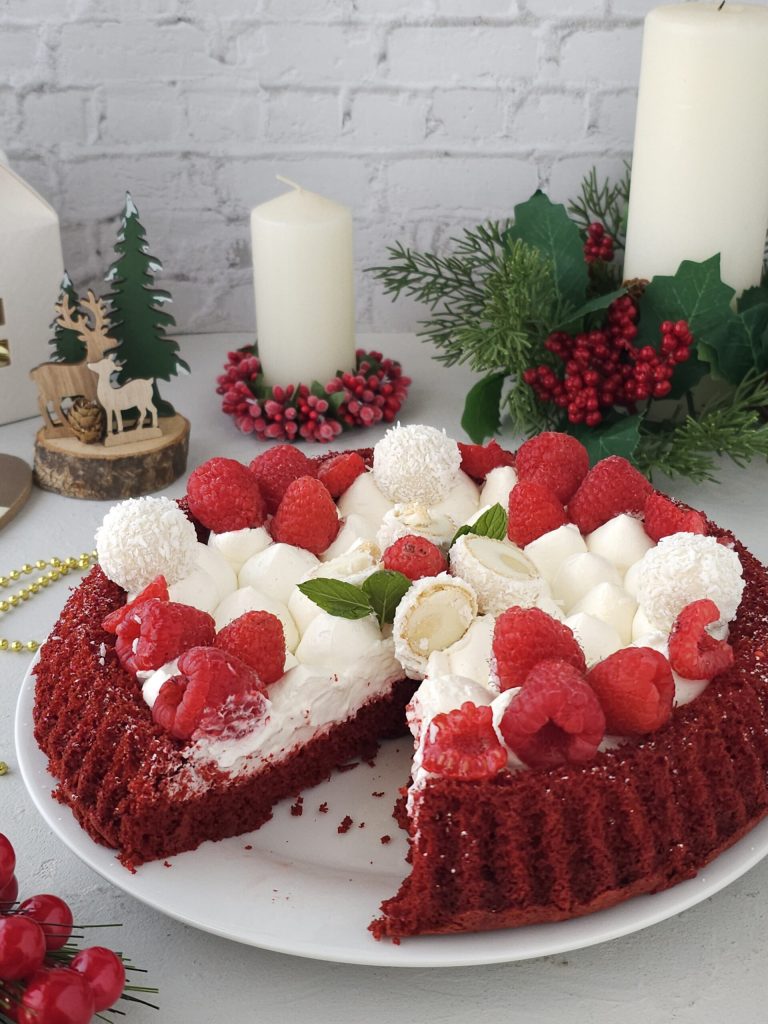 Decorar la superficie con frambuesas frescas y bombones de Raffaello, si queréis darle un toque navideño bastará con usar adornos navideños como galletas con forma de estrella, chucherías, etc.