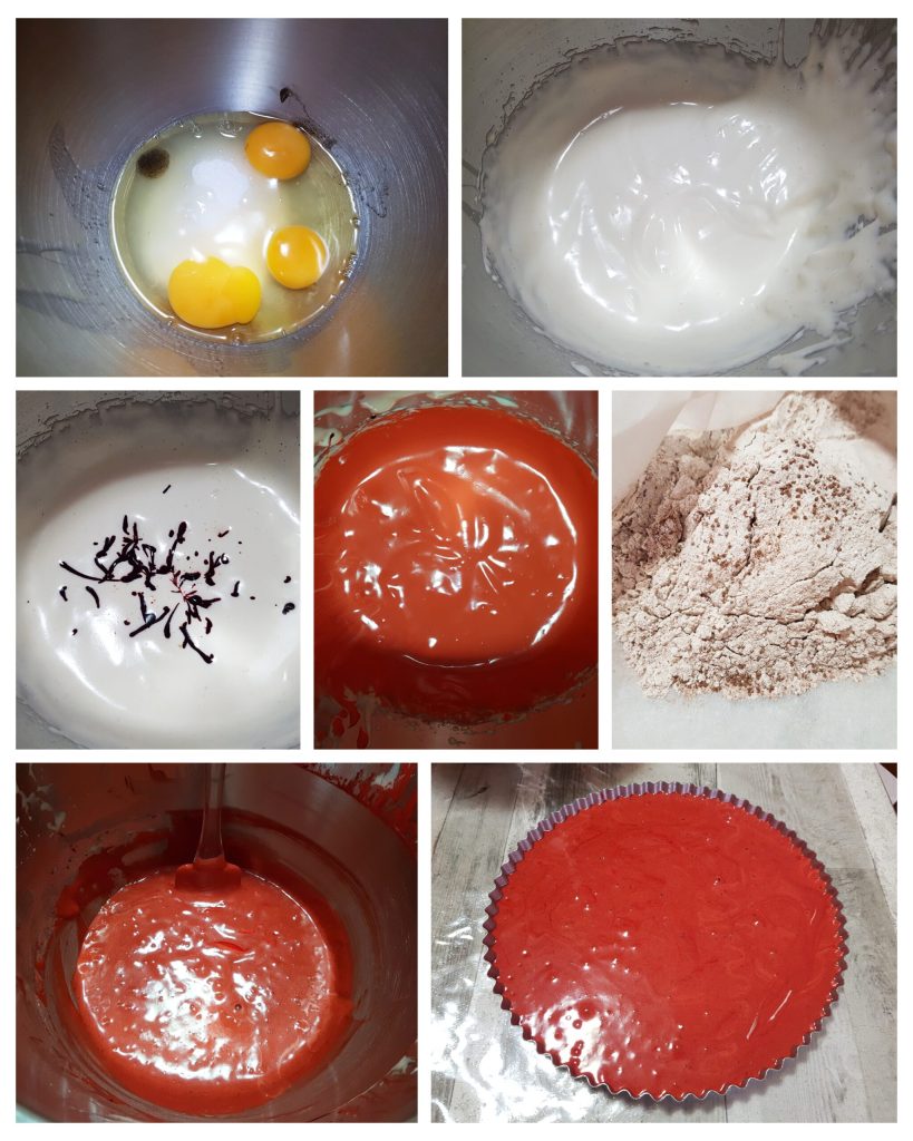Para realizar esta maravillosa tarta blanda red velvet, primero hay que preparar la masa. En un bol grande batir los huevos con el azúcar y la esencia de vainilla durante 15 minutos hasta que estén espumosos y blanquecinos, añadir el colorante alimentario rojo en gel de la marca decora (recomiendo principalmente este colorante alimentario porque lo encuentro el mejor para alcanzar la coloración adecuada), verter también el aceite de semillas de girasol en hilo y la leche y seguir batiendo. Finalmente, añadir la harina y el cacao amargo previamente tamizados con la levadura y la sal y mezclar de nuevo con una espátula de abajo hacia arriba sin desmontar el compuesto hasta obtener una mezcla lisa y homogénea. Engrasar y enharinar un molde para tartas de cm (molde inteligente) y verter la mezcla. Cocer en horno precalentado estático a 180° durante unos 20 minutos. Hacer la prueba del palillo, apagar y dejar enfriar.