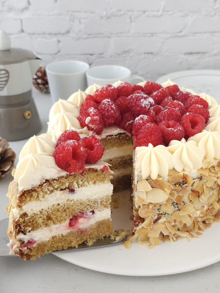 Hola amigos, hoy os propongo esta deliciosa tarta con crema diplomática y frambuesas realizada con un bizcocho de almendras. Una receta adecuada para cualquier ocasión especial para impresionar a amigos y familiares. También para las festividades navideñas esta tarta puede ser ideal para preparar. La combinación de crema diplomática y frambuesas frescas es impresionante. A continuación encontraréis la receta..