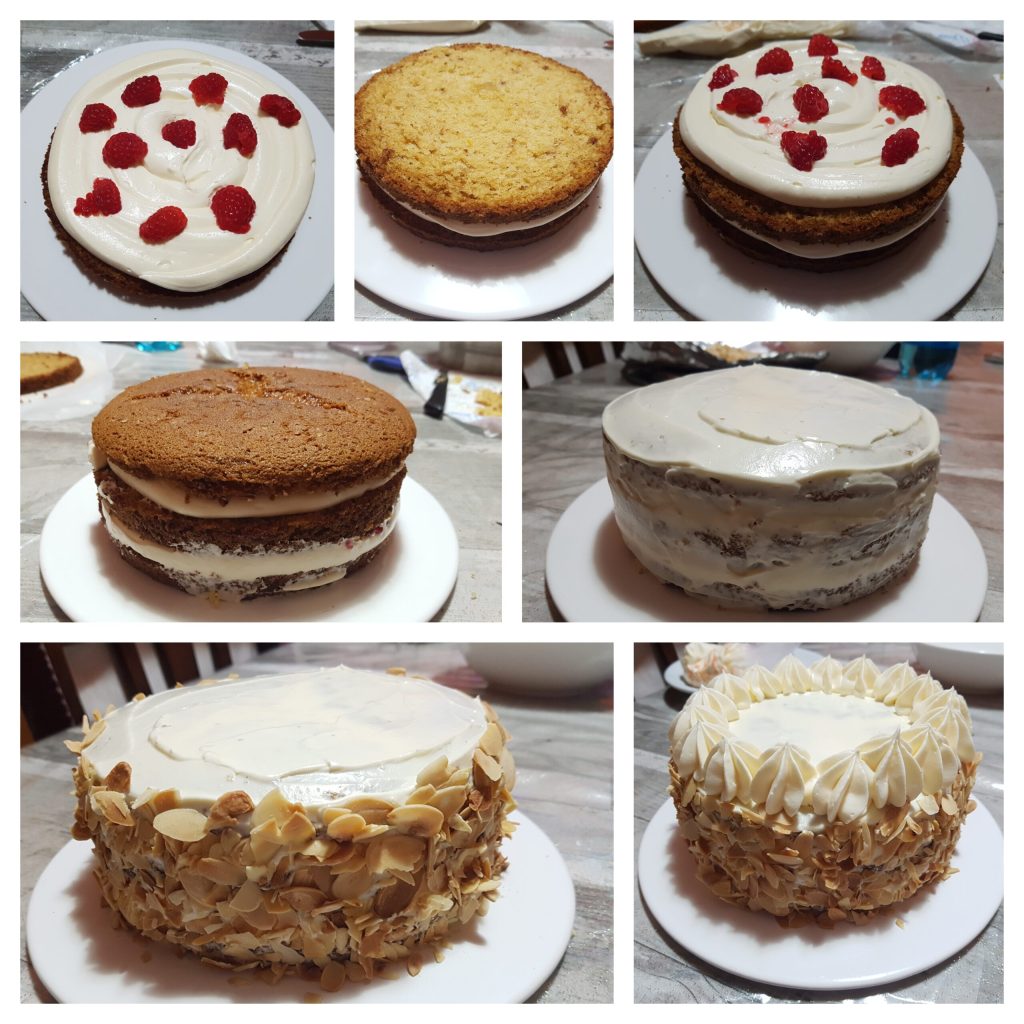 Primero, preparar el jarabe de ron. Verter en un cazo el agua con el azúcar y cocinar durante unos minutos, al hervir apagar después de unos minutos, dejar enfriar y añadir el licor. Cortar el bizcocho obteniendo tres discos, mojar con el jarabe de ron y rellenar cada capa con crema diplomática y frambuesas. Realizar en total 2 capas. Cubrir toda la tarta con la crema restante y la crema restante colocarla en una manga pastelera con boquilla de estrella. Poner la tarta en la nevera para que se endurezca durante 1 hora. Retomar la tarta y decorar todos los bordes con las almendras laminadas ligeramente tostadas y finalmente decorar la superficie con copetes de crema diplomática y más frambuesas.