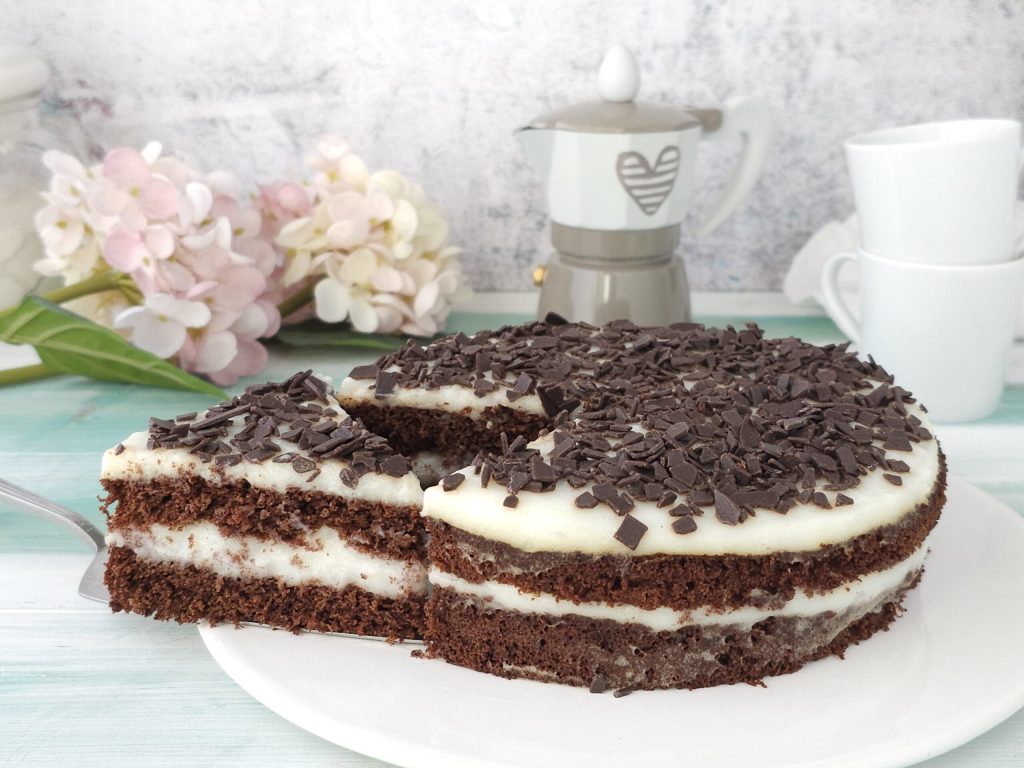 Cortar el bizcocho en dos (si se desea, también se puede humedecer), colocar la crema de leche sobre la base del disco nivelando bien. Cubrir con el otro disco y cubrir la superficie de la tarta con más crema de leche. Decorar la superficie con virutas de chocolate y colocar en el frigorífico para que se asiente durante un par de horas.