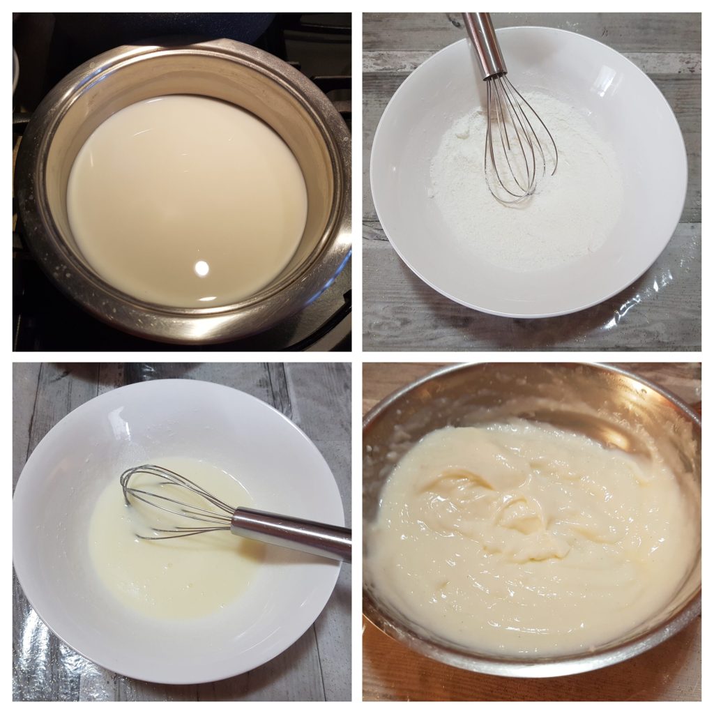 En un cazo o cacerola verter 150 ml de leche, la esencia de vainilla y la pizca de sal y poner a hervir a fuego lento. En un cuenco verter el azúcar granulada y el almidón de maíz, luego añadir los restantes ml de leche, es decir, los otros 150 ml, y mezclar todo con un batidor. Apenas la leche esté a punto de hervir, bajar el fuego y verter la mezcla, dejar que espese unos minutos en el fuego mezclando con un batidor. La crema de leche está lista, verter en un cuenco y sellar con film en contacto y dejar enfriar completamente.
