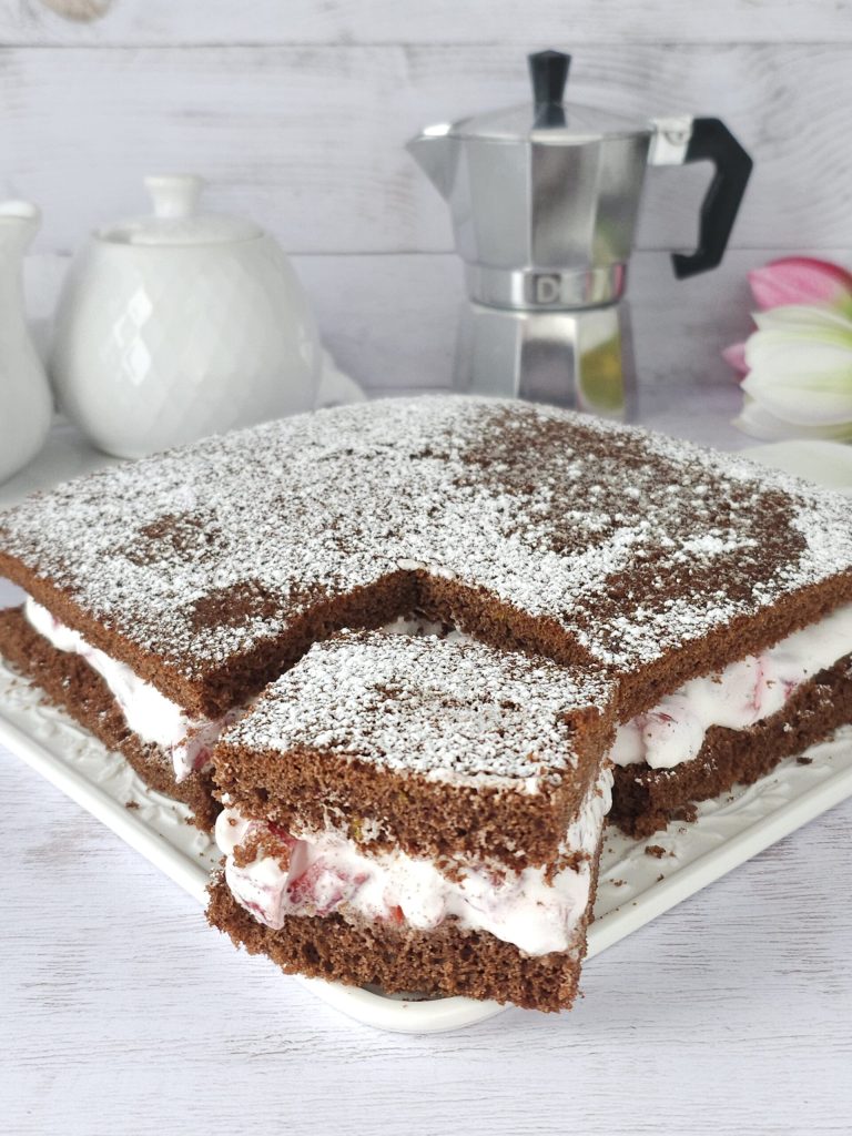 La tarta de cacao rellena de crema de leche y fresas se conserva en la nevera por un máximo de 2-3 días. Si la crema de leche no os gusta, podéis utilizar simplemente nata montada.