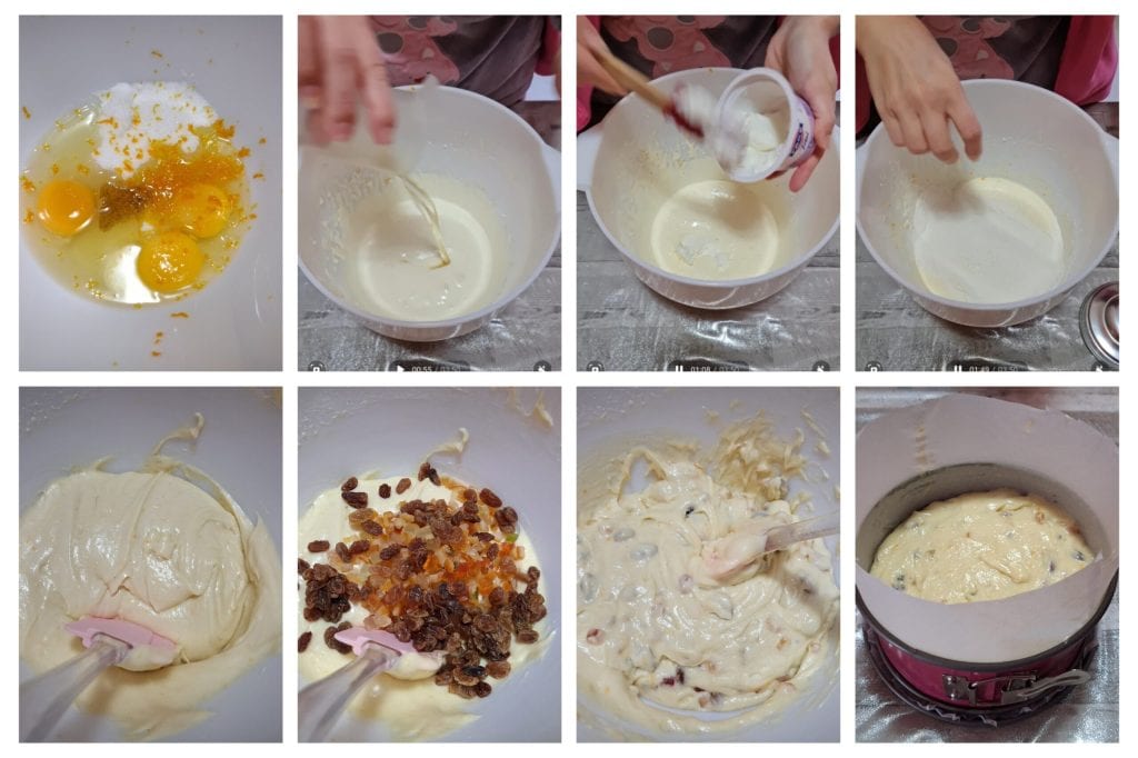 • Para realizar esta deliciosa tarta panettone es necesario, antes que nada, poner a remojo las pasas en un cuenco con el ron. En otro cuenco, batir con batidoras eléctricas los huevos con el azúcar, la cáscara rallada del limón y de la naranja, y la vainilla durante 5 minutos, luego añadir poco a poco el aceite de semillas y mezclar con cuidado. Añadir también el yogur y continuar mezclando. Finalmente, agregar la harina previamente tamizada, la sal fina y la levadura para dulces y mezclar nuevamente con las batidoras eléctricas hasta obtener una masa lisa y homogénea. Por último, añadir la fruta confitada y las pasas escurridas y mezclar con cuidado. Engrasar y enharinar un molde redondo o de panettone de 18-20 cm y verter la mezcla. Cocer en horno caliente estático a 170 °C durante unos 55 minutos. Hacer la prueba del palillo, apagar, sacar del horno y dejar enfriar.