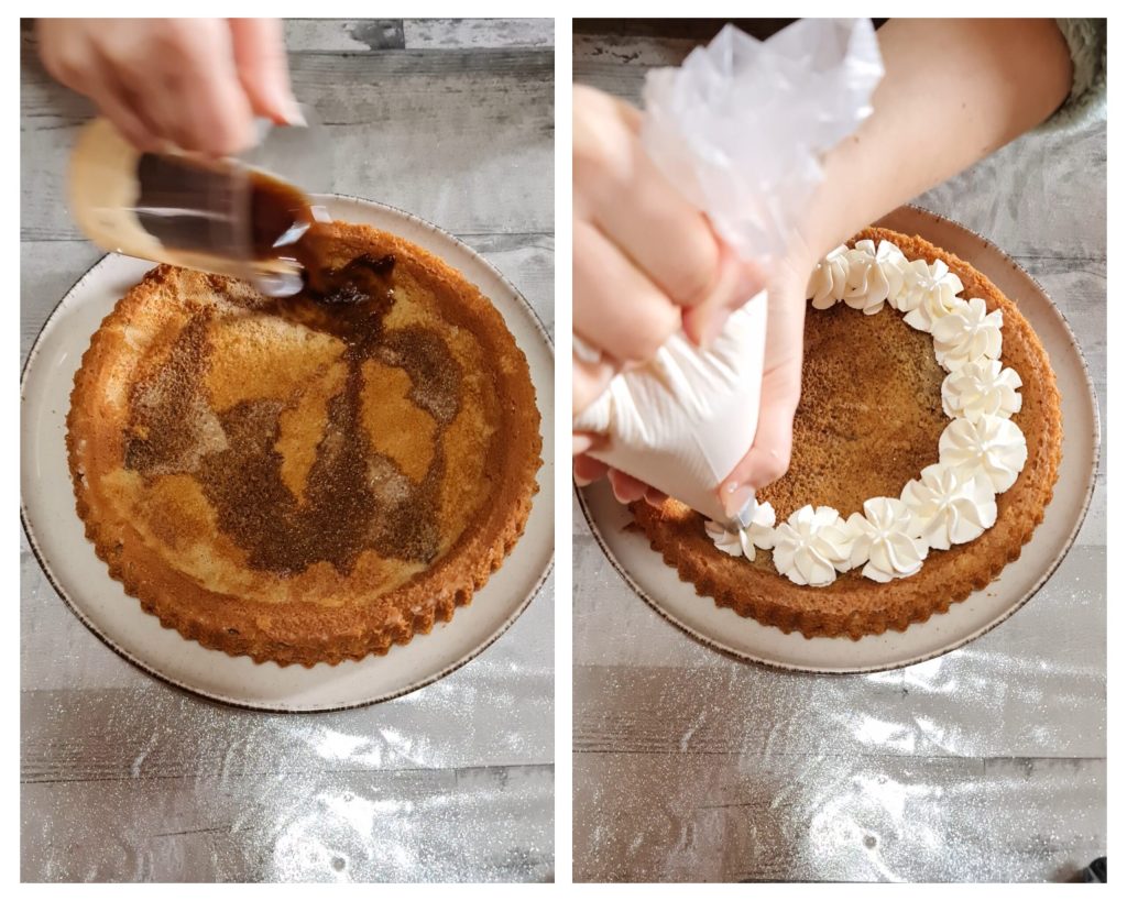 En un bol mezclar el café con el ron y, si queréis, añadir azúcar; yo preferí no hacerlo. Sacar la crema de mascarpone de la nevera y ponerla en una manga pastelera con boquilla de estrella o lisa. Desmoldar con cuidado la tarta suave sobre la fuente y empapar la base con el café usando un pincel de cocina. Rellenar todo el hueco de la tarta con montoncitos de crema de mascarpone y nata. Finalmente, decorar simplemente con cacao amargo en polvo, granos de café y fideos de chocolate.