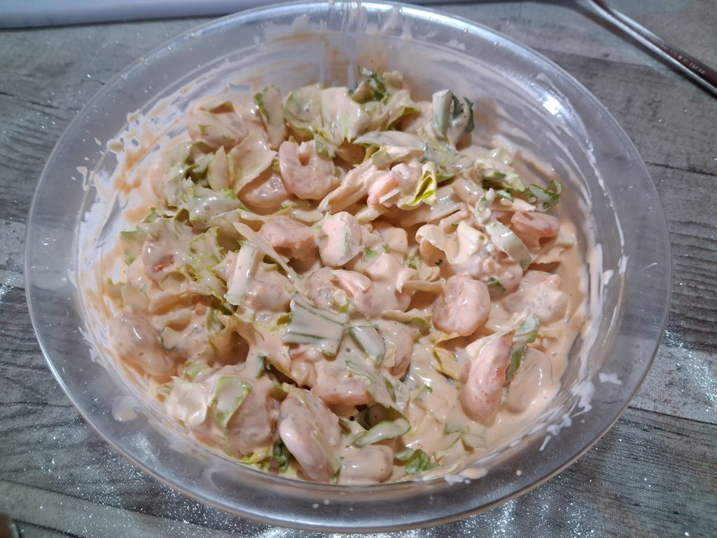 Cocer las gambas en agua salada durante 5 minutos. Escurrirlas y dejarlas enfriar. En un bol, mezclar las gambas ya frías, la mayonesa y algunas cucharadas de salsa cocktail, es decir, la rosa, y mezclar bien. Finalmente, añadir la ensalada cortada en tiras, previamente lavada. Mezclar bien.