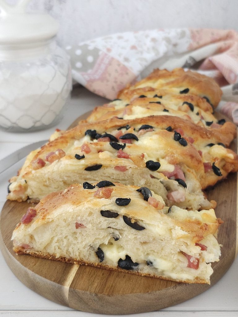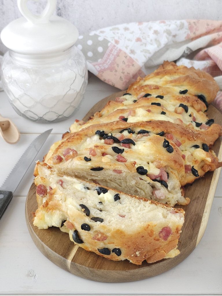 Hola amigos, hoy os propongo esta deliciosa trenza salada con bacon y mozzarella para preparar un aperitivo delicioso o una cena fantástica con amigos. Una masa brioche sin huevos muy suave rellenada con bacon ahumado o cualquier otro embutido, mozzarella fundente y aceitunas negras. ¡Os sorprenderá! A continuación encontraréis la receta…