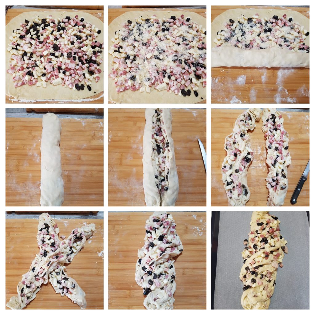 Volcad la masa fermentada sobre la superficie de trabajo enharinada y extendid un rectángulo de aproximadamente 35×28 cm con un rodillo, distribuid el bacon ahumado en cubitos, luego la scamorza o provola cortada en cubitos, las aceitunas deshuesadas cortadas por la mitad y finalmente el queso parmesano rallado. Comenzando por el lado más largo, enrollad la masa hasta el final con el cierre hacia abajo. Sellad bien los extremos y, con un cuchillo, cortad el rollo a la mitad a lo largo. Voltead uno de los dos rollos obtenidos y colócalo en forma de cruz sobre el otro manteniendo el relleno (la parte cortada) hacia arriba. Colocad los dos extremos sobre la superficie de trabajo formando una cruz, luego, de ambos lados, intersecad los extremos. No os preocupéis si durante el proceso se sale algún cubito de queso o bacon, una vez lista la trenza, se podrá colocar el relleno nuevamente entre sus pliegues. Colocad con cuidado la trenza sobre una bandeja para hornear forrada con papel de horno y dejad que la masa repose durante 1 hora aproximadamente. Luego, hornead en un horno estático precalentado a 180 °C durante unos 45 minutos o hasta que esté dorada.