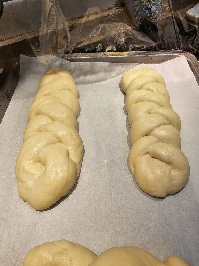 Las trenzas ya leudadas, antes de hornearlas, hay que pincelar la superficie con la yema y unas gotas de leche. Luego hornear en horno estático precalentado a 180º durante 15-20 minutos, obviamente depende de los diferentes hornos. Apagar, sacar del horno y dejar enfriar.