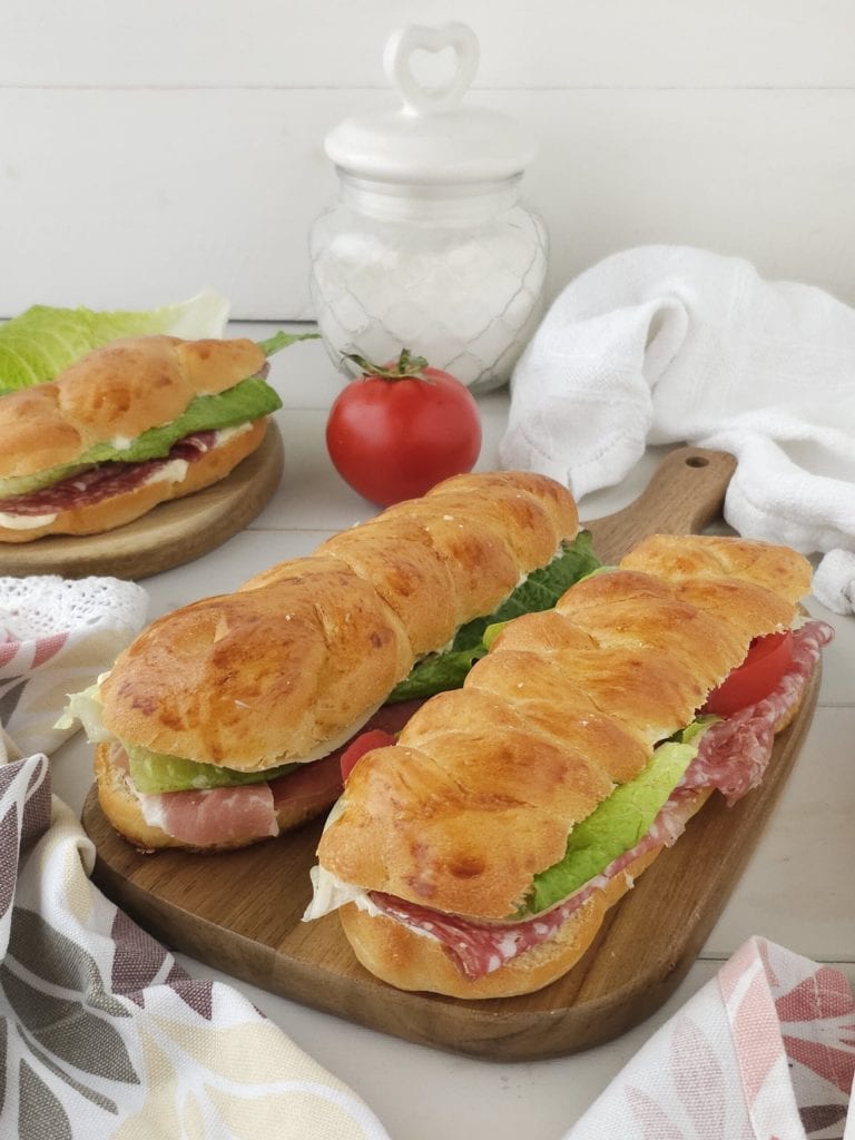 Cortar las trenzas por la mitad y rellenar con los embutidos variados, verduras y mayonesa o queso crema. Colocarlas en una bandeja y ponerlas en la nevera hasta el momento de disfrutarlas. Y ya están listas las trenzas brioche saladas rellenas, adecuadas para celebrar y sorprender a amigos y familiares. Espero que os guste esta última receta mía, hasta la próxima amigos.